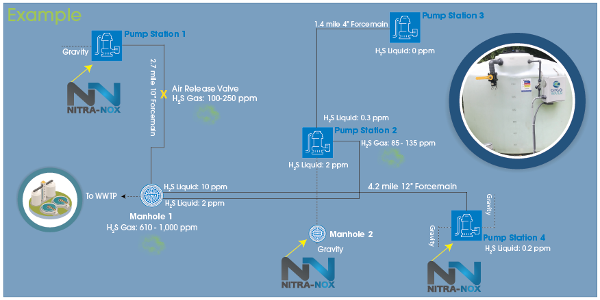 The hydrogen sulfide coming from Pump Station 1 will be inhibited by feeding at Pump Station 1. The hydrogen sulfide coming from Pump Station 4 will also have to be treated at Pump Station 4. The hydrogen sulfide coming from Pump Station 2 is further evaluated and it’s determined that the majority of the hydrogen sulfide is coming from the gravity flowing into Pump Station 2. Feeding Nitra-Nox at Manhole 2 will inhibit the hydrogen sulfide at Pump Station 2 and discharge into Manhole 1 prior to the wastewater treatment plant.